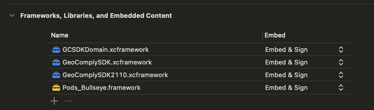 On the General tab, verify the Pods_YourGameName.framework , GeoComplySDK.xcframework , GeoComplySDK280.xcframework, and GCSDKDomain.xcframework are listed under Frameworks, Libraries, and Embedded Content and toggle each to Embed & Sign if not already set.
